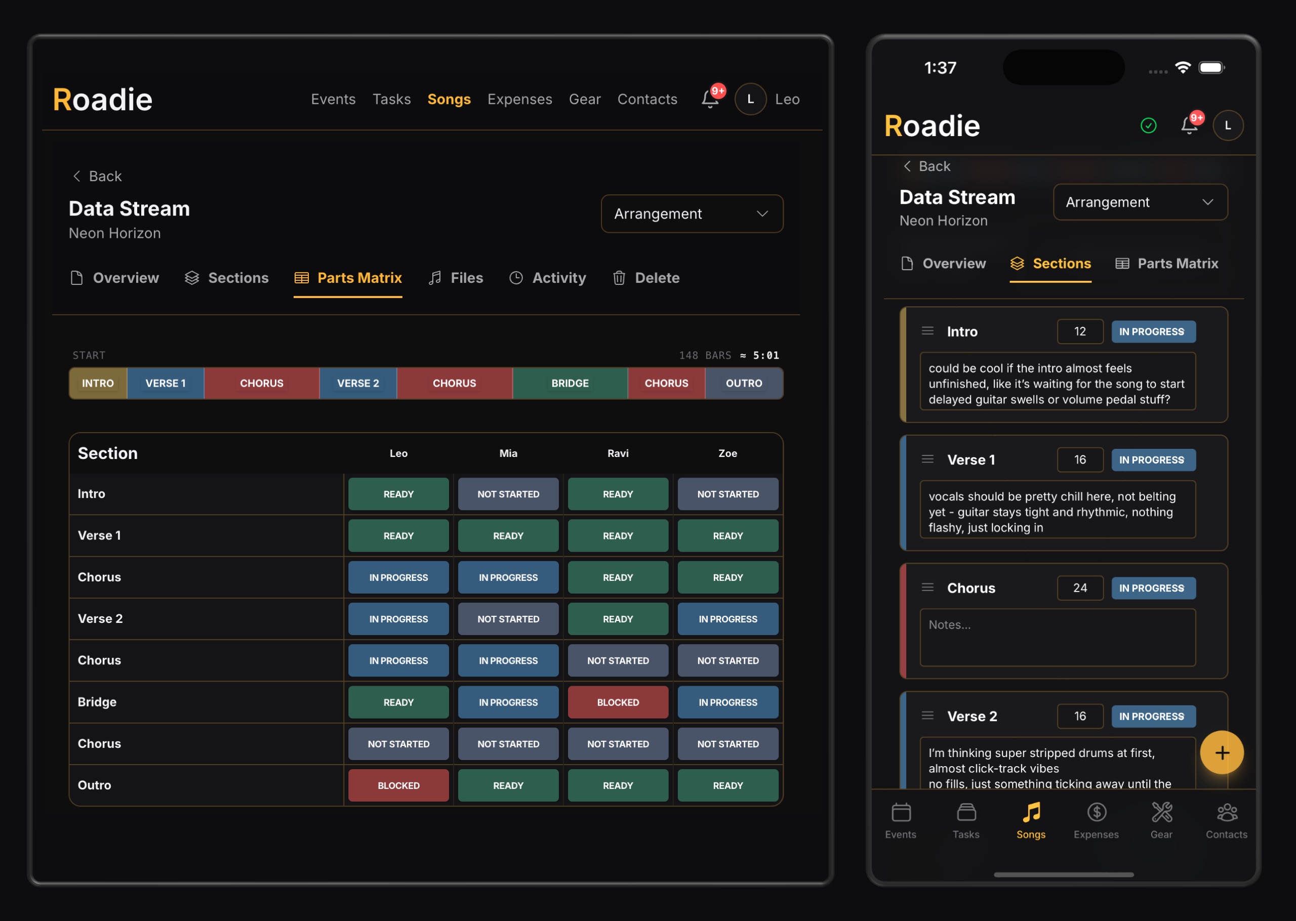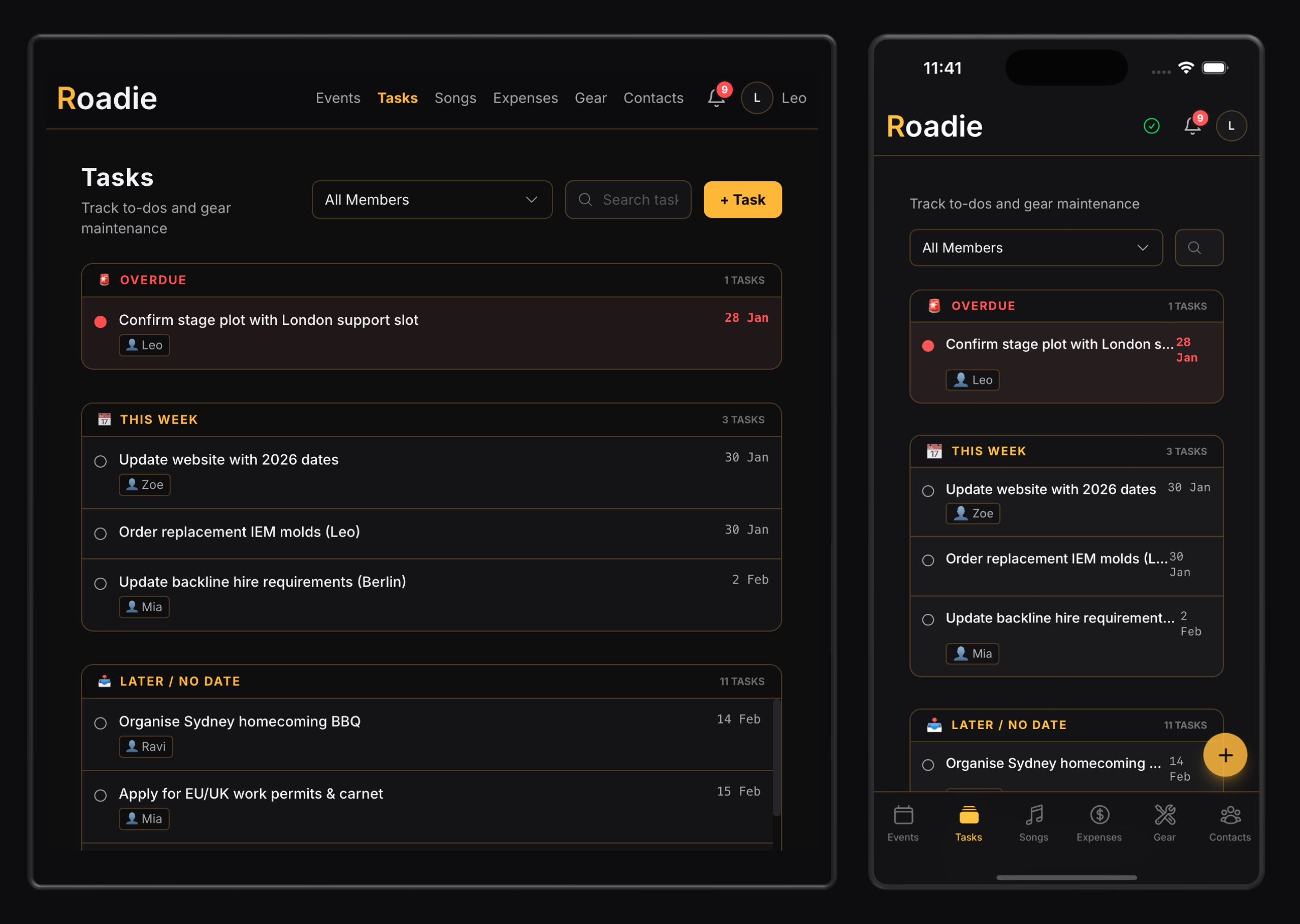Roadie brings gigs, rehearsals, tasks, gear, and expenses into one focused workspace. Built for bands who juggle day jobs, side projects, and late-night load-outs.