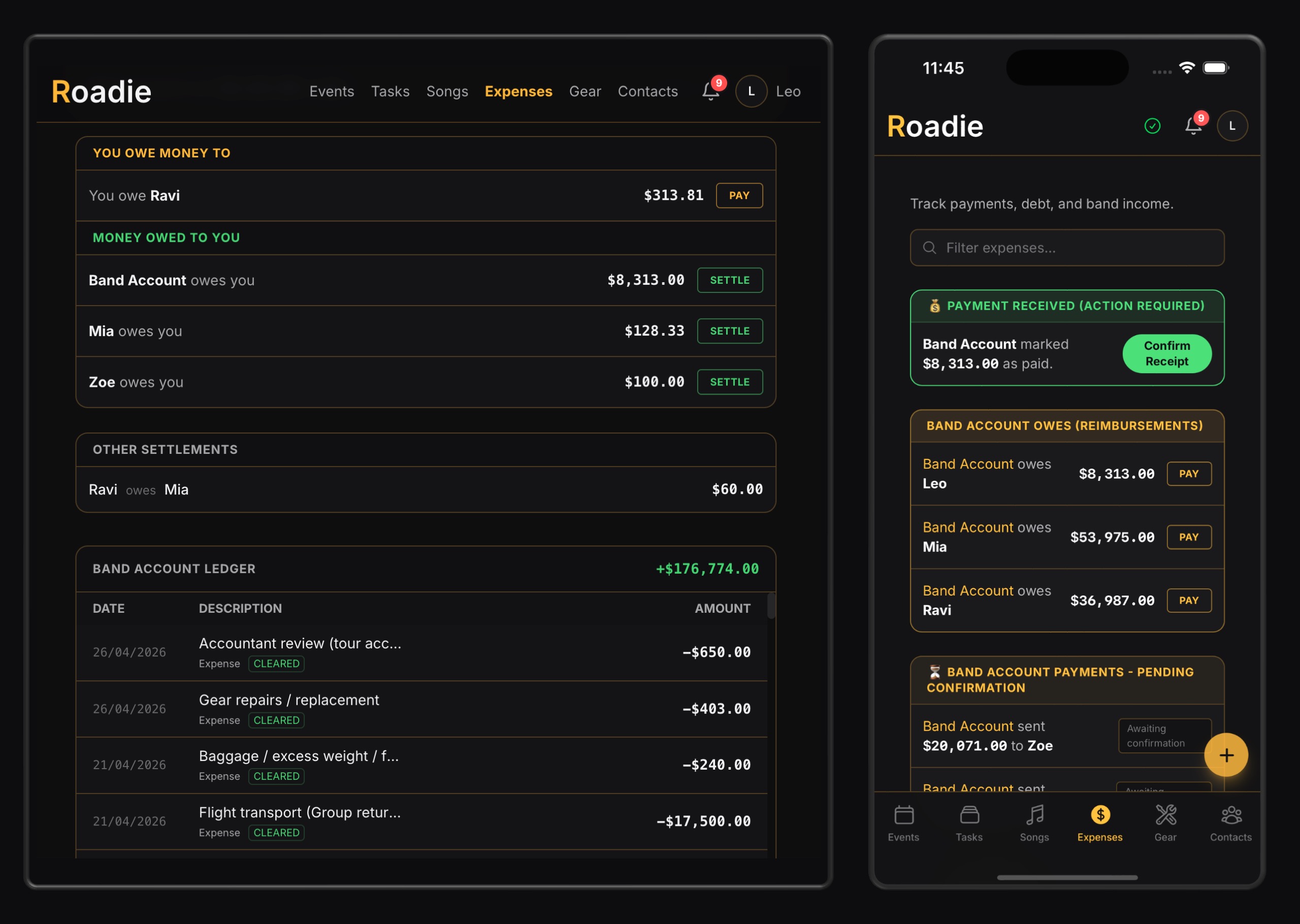Roadie brings gigs, rehearsals, tasks, gear, and expenses into one focused workspace. Built for bands who juggle day jobs, side projects, and late-night load-outs.